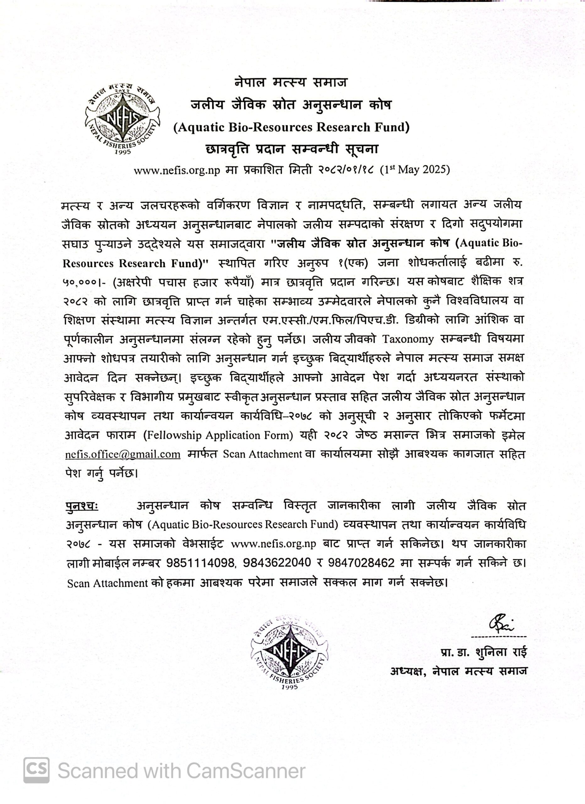 नेपाल राज्यको ऐतिहासिक प्रजातान्त्रिक व्यवस्थाको पुर्नस्थापनाको साथसाथै विभिन्न व्यवसायी / Professional झै राष्ट्रमा उपलव्ध मत्स्य क्षेत्र सम्बद्ध असिम श्रोत साधनको समुचित सदुपयोग गरि राष्ट्रको अर्थतन्त्रमा योगदान पुर्याउन मत्स्य व्यवसायको विकास, अनुसन्धान, शिक्षण, उद्योगमा संलग्न सबै सरोकारवाला (Stakeholders) समुदाय संगति भएर जानु पर्छ भन्ने सोचले यस नेपाल मत्स्य समाज (Nepal Fisheries Society, NEFIS) को आवश्यकता सम्बन्धि अवधारणा श्रृजना भएको हो ।